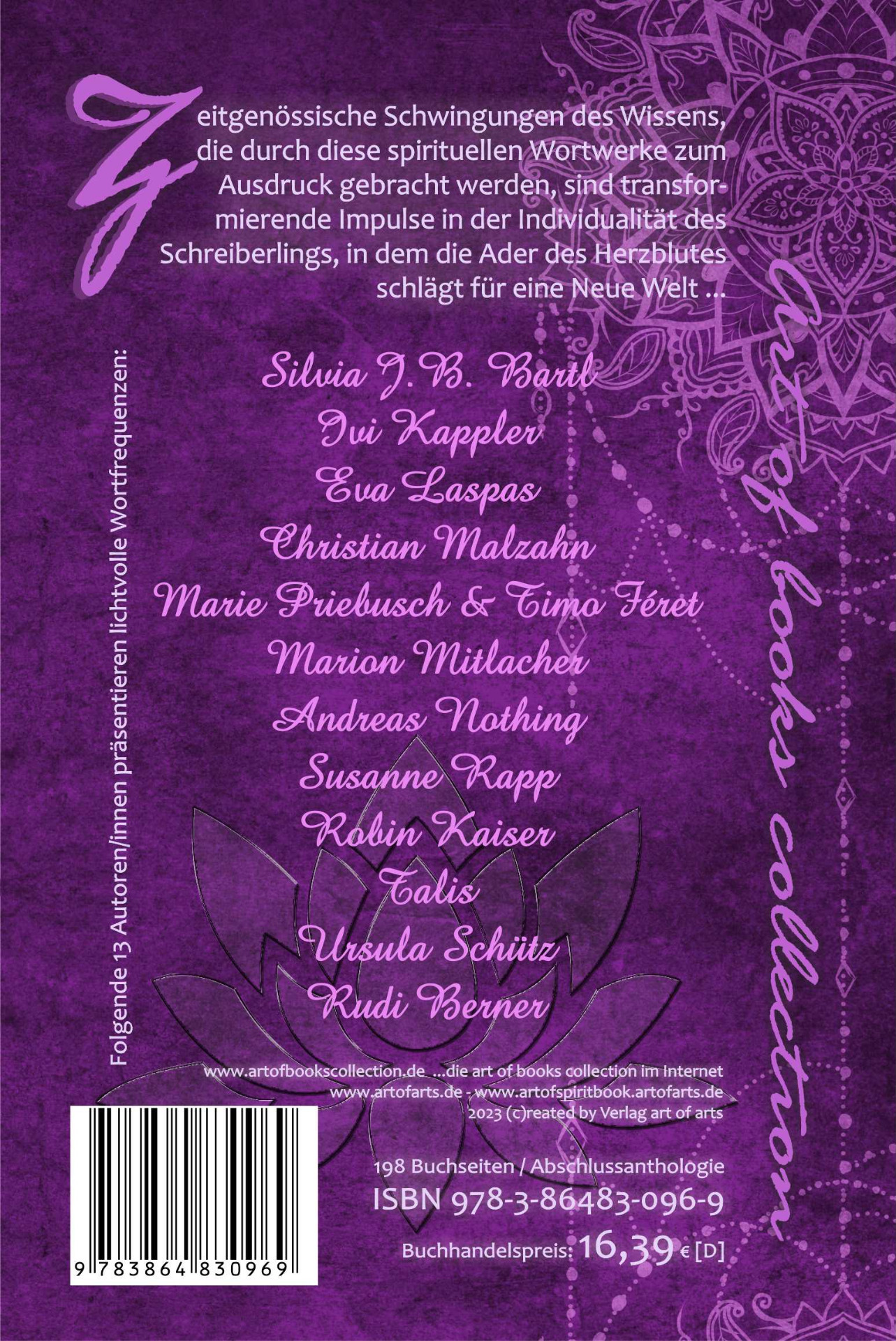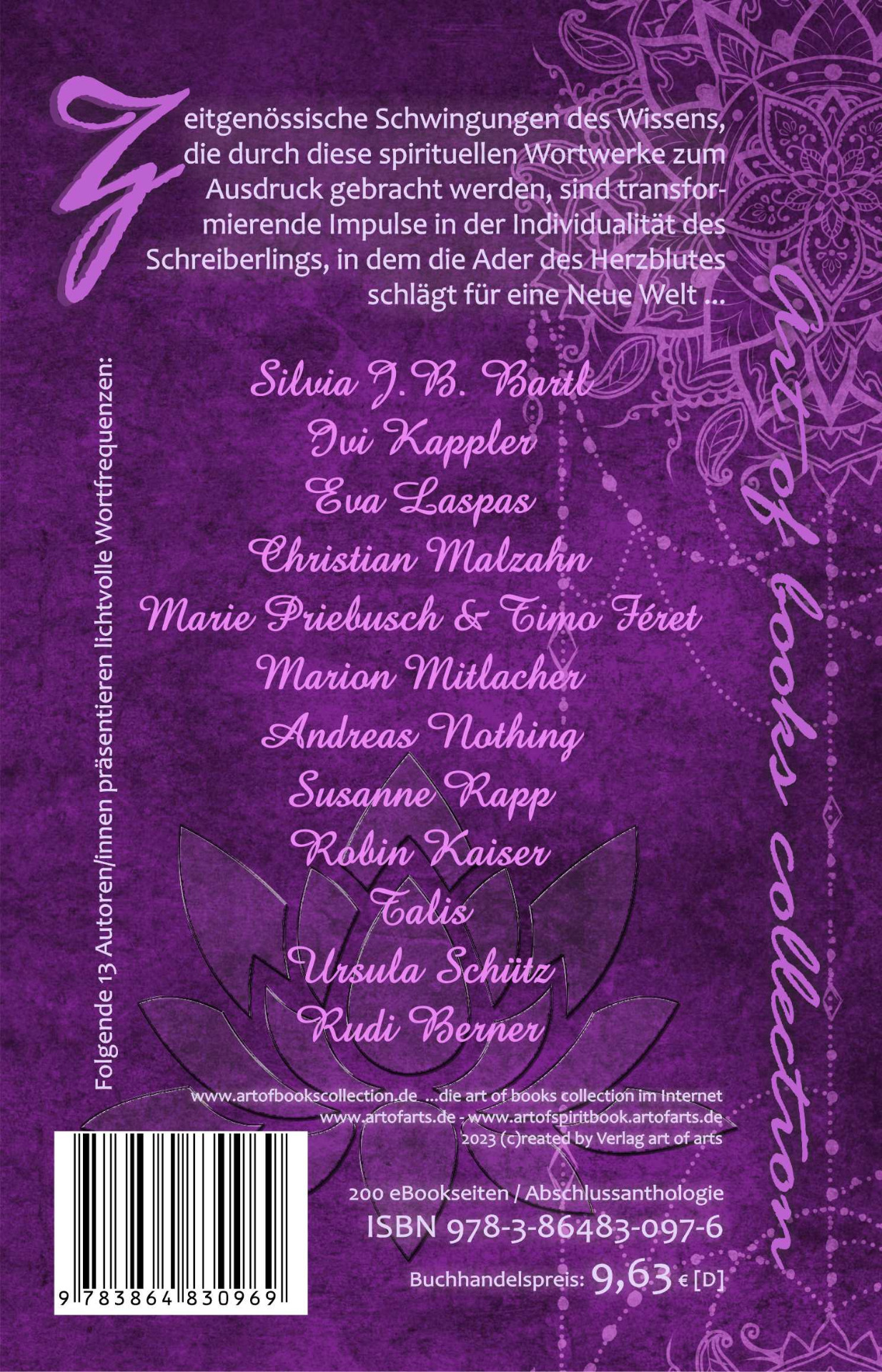 Unter dem Motto: schreibst du schon oder transformierst du noch? Präsentieren sich 13 ausdrucksstarken Federn der Autoren/innen, die mit wertvollen spirituellen Gedanken lichtvolle Weisheiten in Worte formulierten und zu Papier brachten, um daraus ein Buch zu erschaffen. Ein Buch für alle Bewussten und Erwach(en)ten, die fühlen, dass es noch mehr als alles geben muss. Eine Wesensform, welche Körper, Geist und Seele leuchten lässt und Herzen mit Harmonie und Freude füllt. Jede/r von ihnen ist ein Teil von diesem einzigartigen Ganzen, denn dies ist art of spirit … Treten Sie ein in diese spirituelle Welt der unendlichen Facetten, voller Wissen und Faszination. In das wundersame Wesen der außergewöhnlichen Literatur und freuen Sie sich, dadurch auch ein Teil von art of spirit zu sein – in Gedanken, Worten und Lesetaten, der durch Ihren Blick hinter die Kulissen mit Erstaunen belohnt wird. Fühlen Sie sich ein und erleben den individuellen Ausdruck des Buchstabenspiels, der bestimmt auch Ihre Gedanken beflügelt und Gleichklang erzeugt, und speziell für Sie präsentiert wird. Tauchen Sie ein in das spirituelle Wortwerk, in eine bewusstere Neue Welt, mit liebevollen Herzfrequenzen und Schwingungen, die Seele, Geist und Körper beflügeln. Aus Ihrer Perspektive, sozusagen als Betrachter/in und Wahrnehmende/r. Spirituelle Erzählungen, weise Textpassagen, lyrischen Herzreimen und zeitgenössischen Wortschwingungen, die Ihnen art of spirit präsentiert. Lassen Sie sich darauf ein und fühlen Sie Ihr inneres Kind, die Wahrheit Ihres Herzens, den Balsam Ihrer Seele, das Ihrem Geist Flügel gibt. Art of spirit - ein ganz besonderes Buch, das exakt in den heutigen Zeitgeist passt, für Liebhaber zeitgenössischem Wissen, das uns alle verbindet und auch Ihr Wesen leuchten lässt.